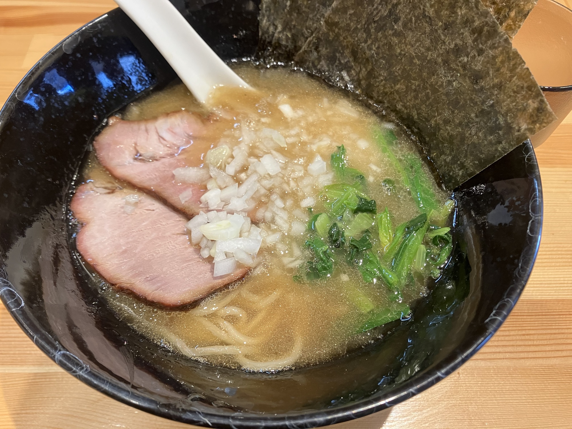 ラーメンにはうっすらと油が膜になっており、熱々で濃厚でした。味も濃いめ。美味しい。